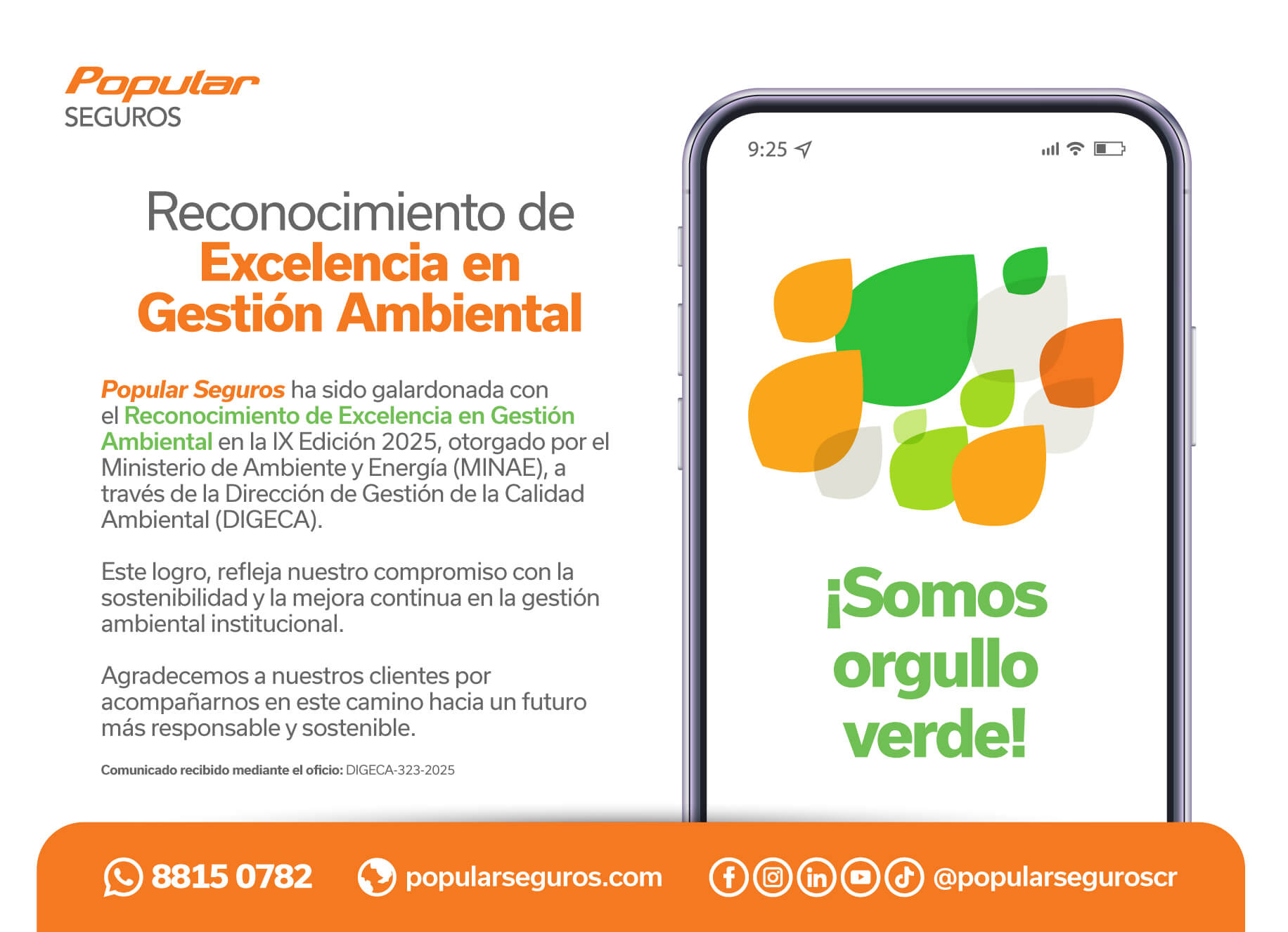 Nos enorgullece compartir que Popular Seguros ha sido galardonada con el Reconocimiento de Excelencia en Gestión Ambiental en la IX Edición 2025, otorgado por el Ministerio de Ambiente y Energía (MINAE), a través de la Dirección de Gestión de la Calidad Ambiental (DIGECA).